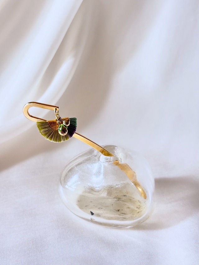 出店イベント限定のお品物になります。 もし気になる方がいらっしゃいましたら お問い合わせ下さい! 着物を着ると紙を触ったり、文字に触れたり、少しアナログな時間が魅力的に感じられてなりません。好きな本と結い髪や帯を行き来したりする小物って粋と言うか素敵な仕草だなと思い、形にしてみました。 __________ 〔再生産不可〕 こちらは製作の過程で、更に素材を捨てずに生まれた一点物。どれも同じものはできませんので、この特別な一点をお楽しみください。お蚕さんの働きと命に感謝し、残りものの『福』をあなたに贈ります⭐︎ __________ フック型のモノはブックマークですが 帯のちょっとしたアクセサリーにもなります。 読書中は帯にさしておいて、 必要な時にはスッと抜いて本に挟む… そんな使い方ができる センスのいいブックマークです! 結い髪にサッとさしてもいいんですよ! 大変粋です。 箸をかんざしにしたように そこに在る物1つを工夫しながら お洒落と暮らしを楽しむ着物文化や 日本のスタイルを素敵に感じ 『本と帯と髪と』 〜センスのいいブックマーク〜 と、表しました。 例えばこの糸房に 好きな香りをふきかけてみるのも良いでしょう。 伸びやかで素敵なひと時を お過ごしいただければ幸いです。 『センスのいい』は駄洒落デス。 でも本当にセンスが良いかもしれません。 …贈り物にも是非! 着れなくても着物LIFE.ᐟ.ᐟ What a wonderful life is cultural life! ᴹᴼᴹᴼᵀᵁᶳ 〔サイズ〕 ▼半円サイズ(レギュラーより少し大きめ) 横幅(直径)3.5cm〜4cm×高さ(半径)1.8cm ※金具(半径2.5cm) エンジェルチャームはフランスの物です。 アンティークピンと合わせてみました。 __________ ★この商品をもっと深める★ 『文化的耳飾りnemu』の深掘りアイテム談 糸が教えてくれたコト... https://momotus.thebase.in/blog/2020/10/13/094915 __________ ★2019年リンネル11月号・高畑充希さん連載の 『手しごとコトコト』に掲載されました。 宜しければblogの方もお楽しみください。 https://momotus.thebase.in/blog/2019/09/29/125337 __________ 《完成品/受注生産品について》 ◎こちらは『完成品』です。 ※※ ご注文日から1週間以内で順次発送可能 ※※ ご購入前に、発送に関していくつかの注意点がありますので一度、下記リンクをご一読くださいませ。 https://momotus.thebase.in/law 《ご購入について》 ★こちらはハンドメイド商品です。1つ1つ手作業で制作しているため、色や形に若干の違いが生じる場合がございますのでご了承ください。 ★お使いの端末や閲覧環境により、写真と実物の色味や質感が多少異なって見えることがございます。 ★デリケートな作品ですので、強い力を加えたり、ひっぱったりしないようご注意ください。 ★雨や汗など濡れた状態でのご使用は、衣類などへの色移りの原因となります。ご注意ください。 ★商品は、個人使用を目的とした範囲でのみ購入が可能です。第三者への転売を目的としたご購入はご遠慮ください。 ★sold outの商品でも同じ物の購入を希望される場合は、メールにてお気軽にお問い合わせ下さい。