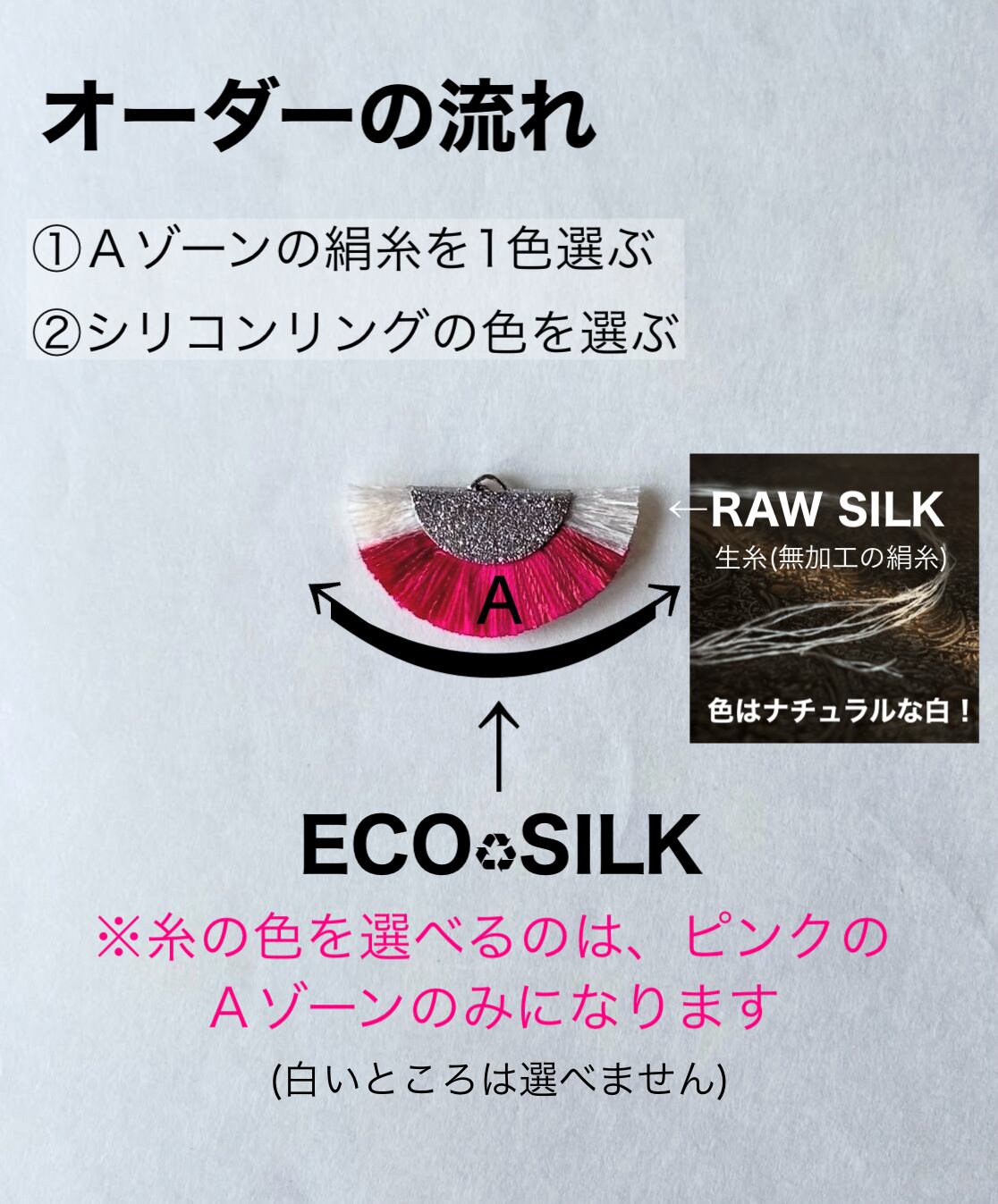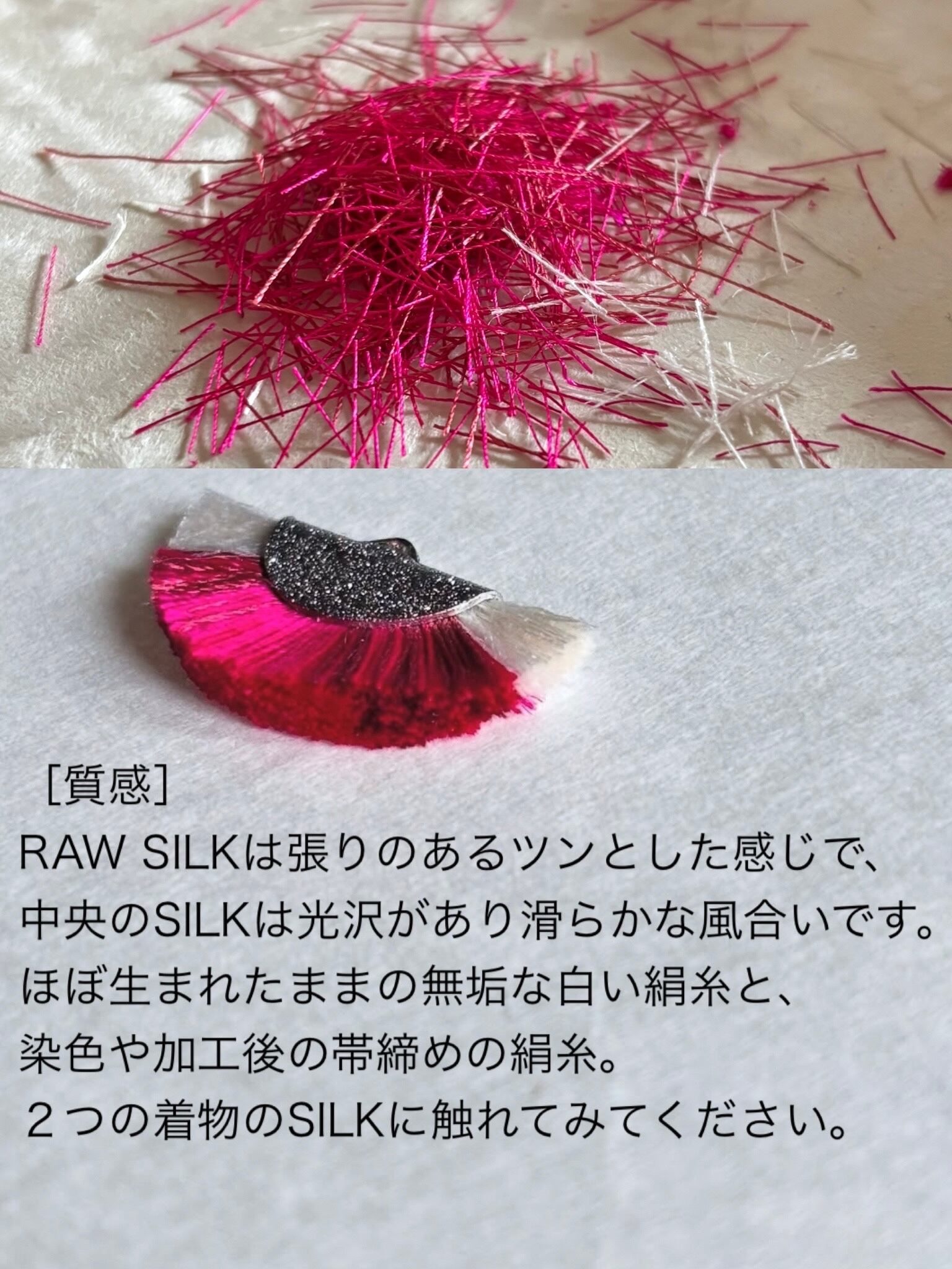 ※RAW SILKの白い絹糸は長野県で作られている国産の絹糸です。
