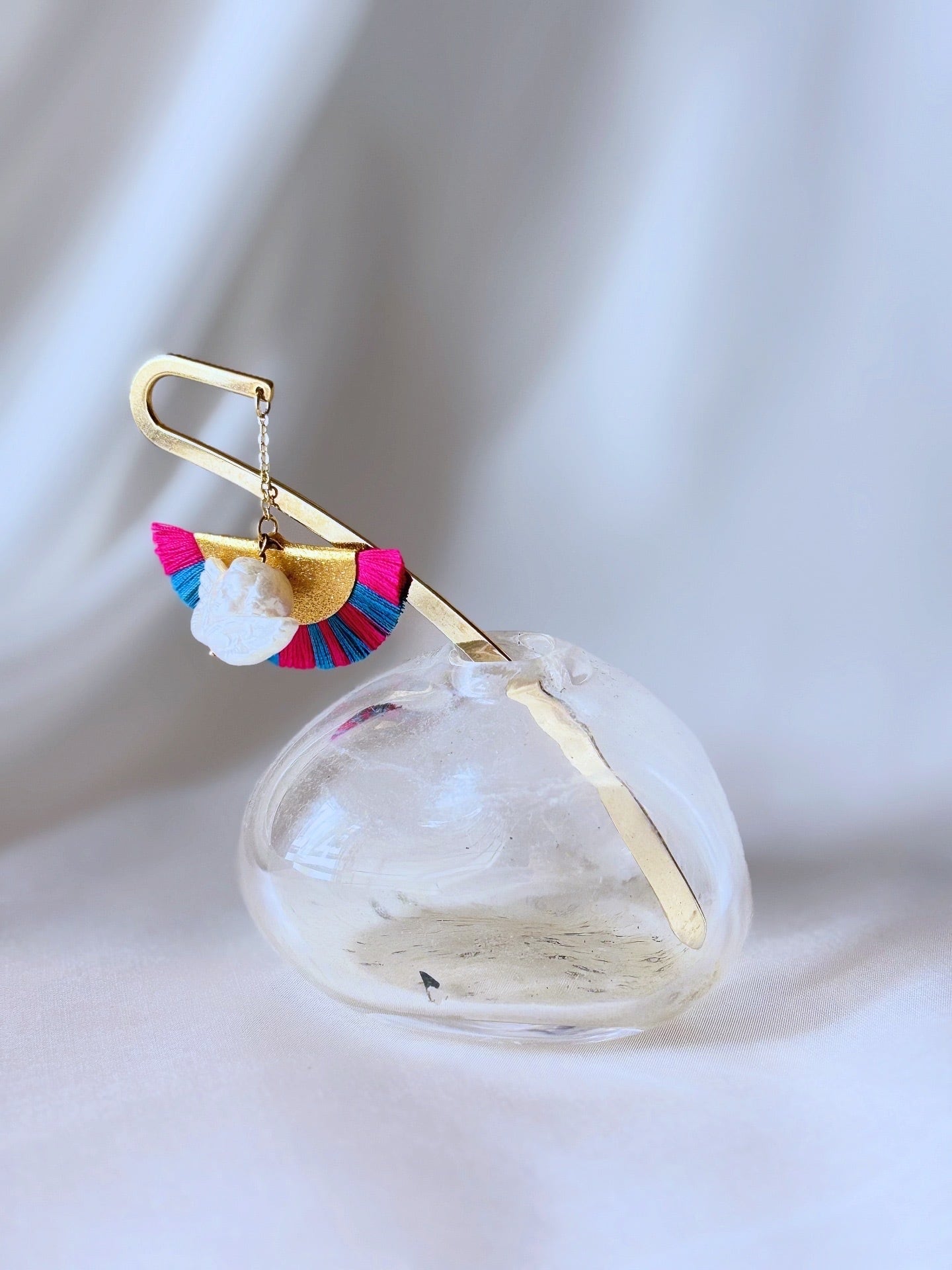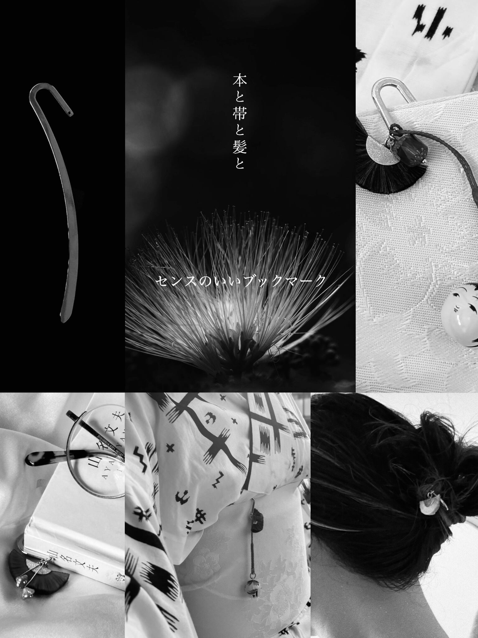 着物を着ると紙を触ったり、文字に触れたり、少しアナログな時間が魅力的に感じられてなりません。好きな本と結い髪や帯を行き来したりする小物って粋と言うか素敵な仕草だなと思い、形にしてみました。