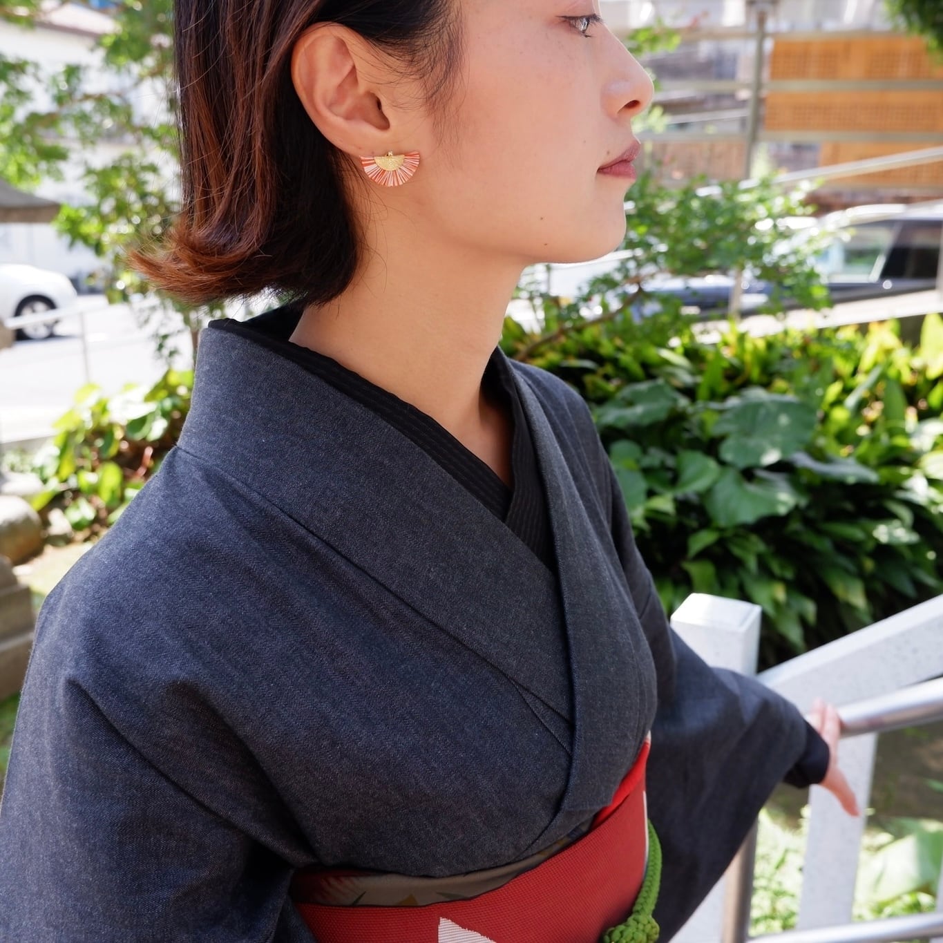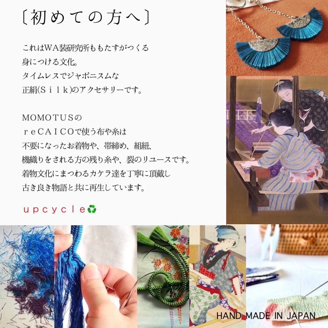 使用するつむぎ糸は全て草木染めで、毎年の植物達から頂き、着物の反物を織る方の手しごとによって手染めされた織物の残り糸です。MOMOTUSの耳飾りはその残糸を循環させるように作っています。