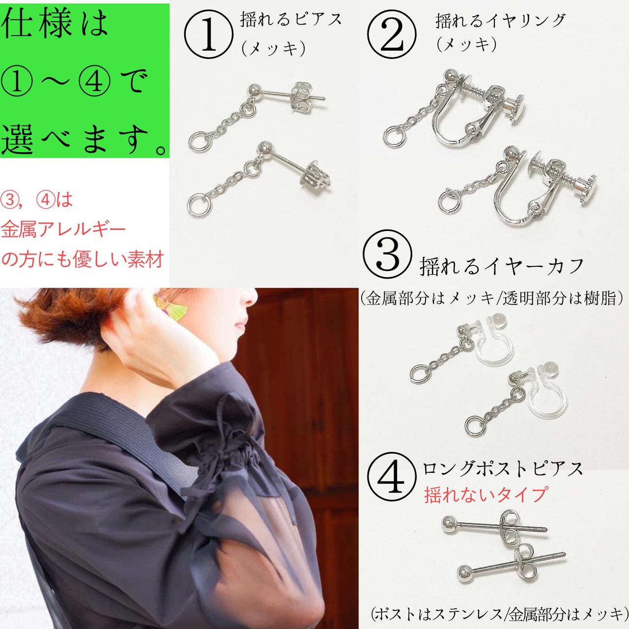 ネムの花の耳飾り『NEMUgi(ネムギ)』は着物の反物になるつむぎ糸を使って作られているシリーズです。ネムのつむぎでNEMUgiです!