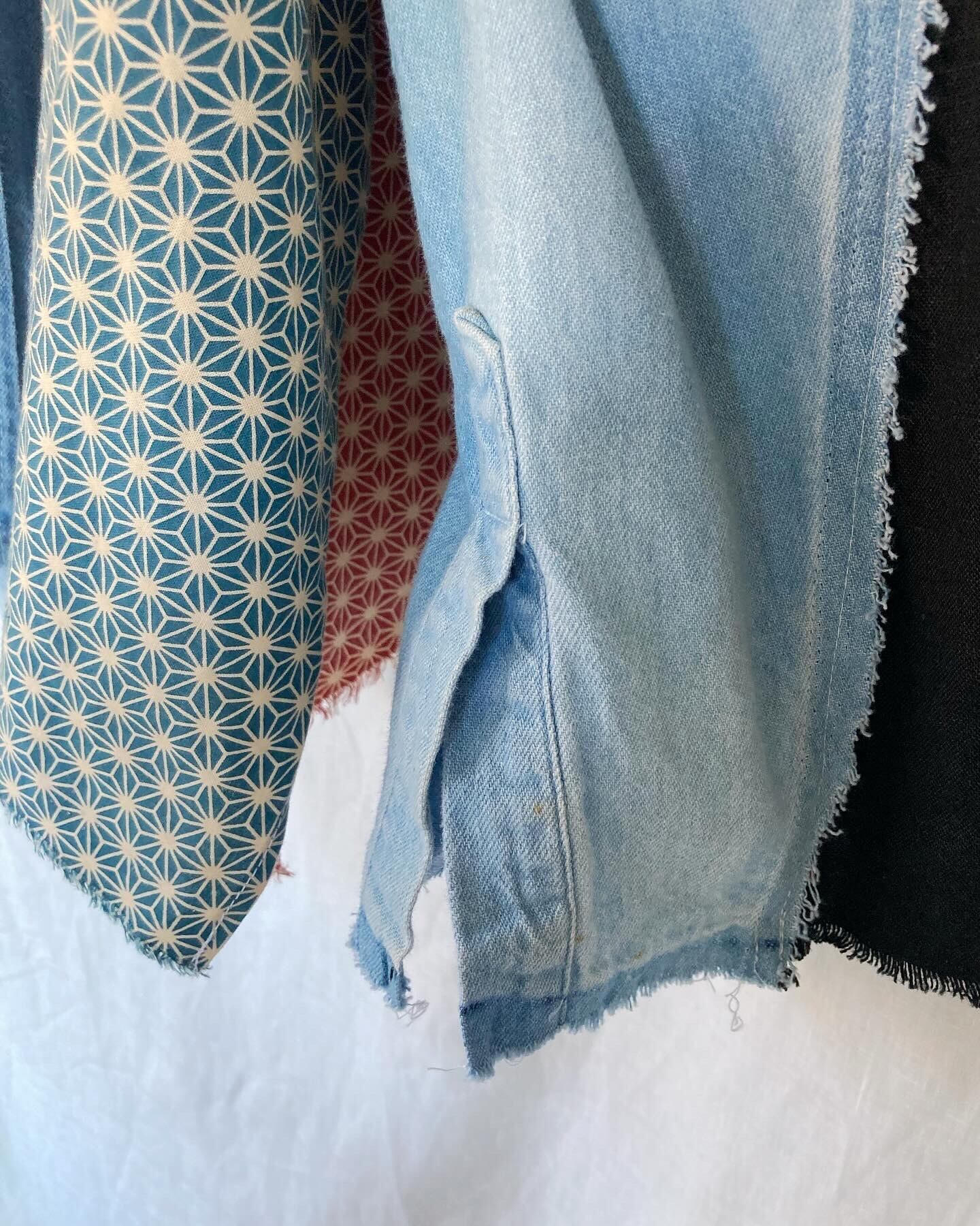 着方は、シャツで着るか、ジャケットで着るか等、いくつかあります。シャツで着るなら、前ボタンを閉めてスタンドカラーを楽しむスタイルや、シャツえりを内側に倒してVネックを作れば鯉口風にもなります。Vの深さもボタンでお好きにどうぞ!