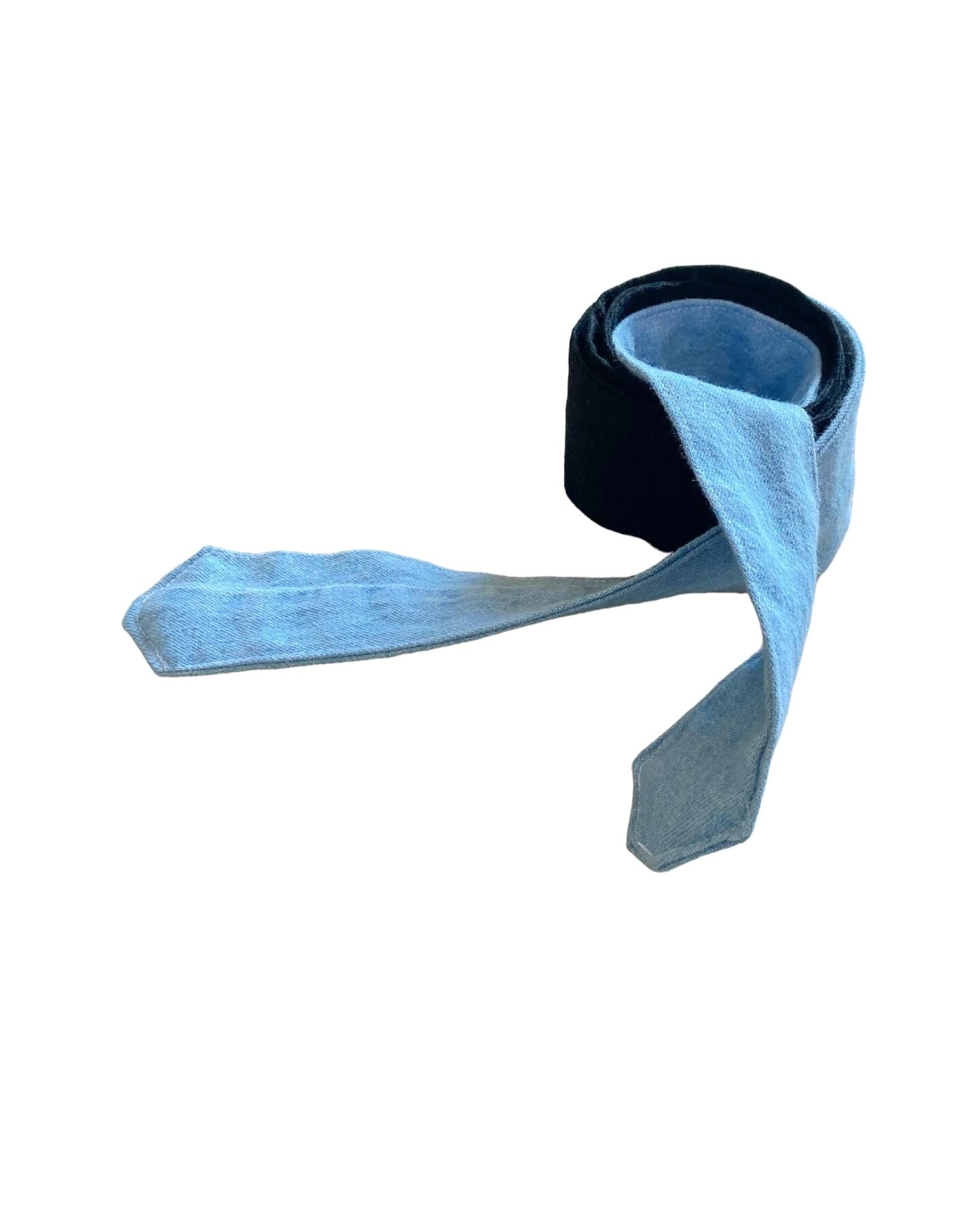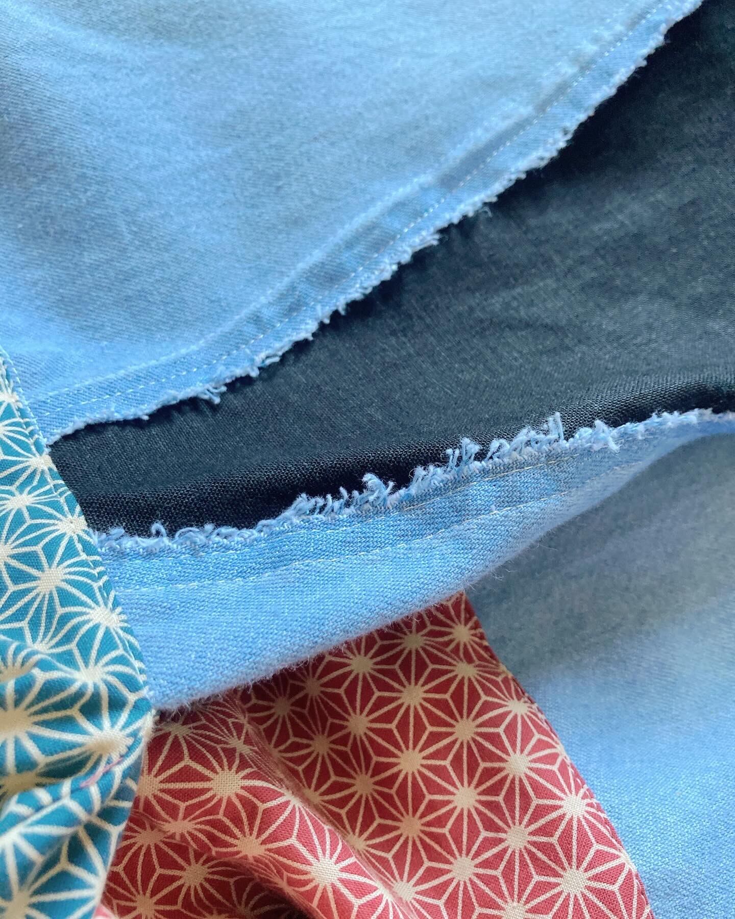 今回こちらは、そのオーダーの時に作ったしごと着の部分(作務衣のスタイル)を省いて、もう少し普段着として楽しめるように、ガウンというか羽織りのタイプにしました。ベルトも共生地を使うなどしてこだわっています。