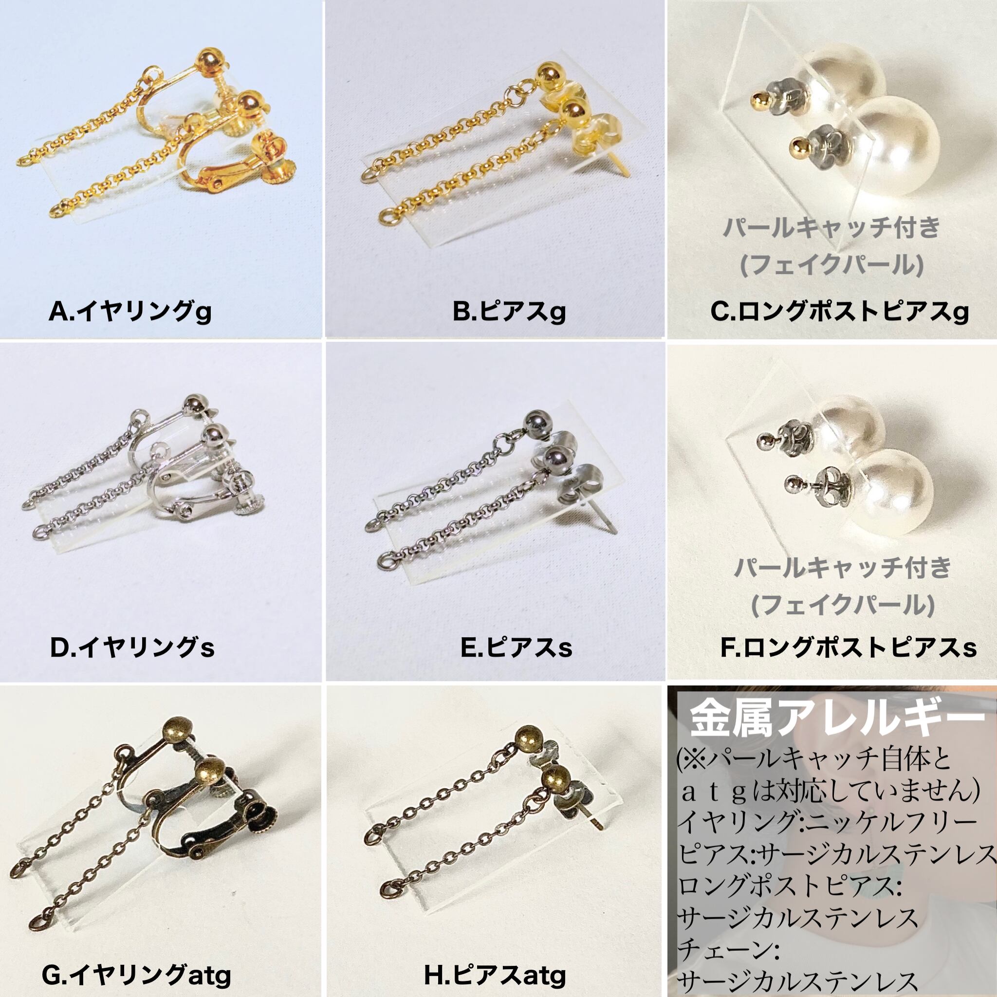 ※ロングポストピアスはポストがステンレス。それ以外のイヤリング、ピアスは全てニッケルフリー。(チェーン、キャッチは除く)