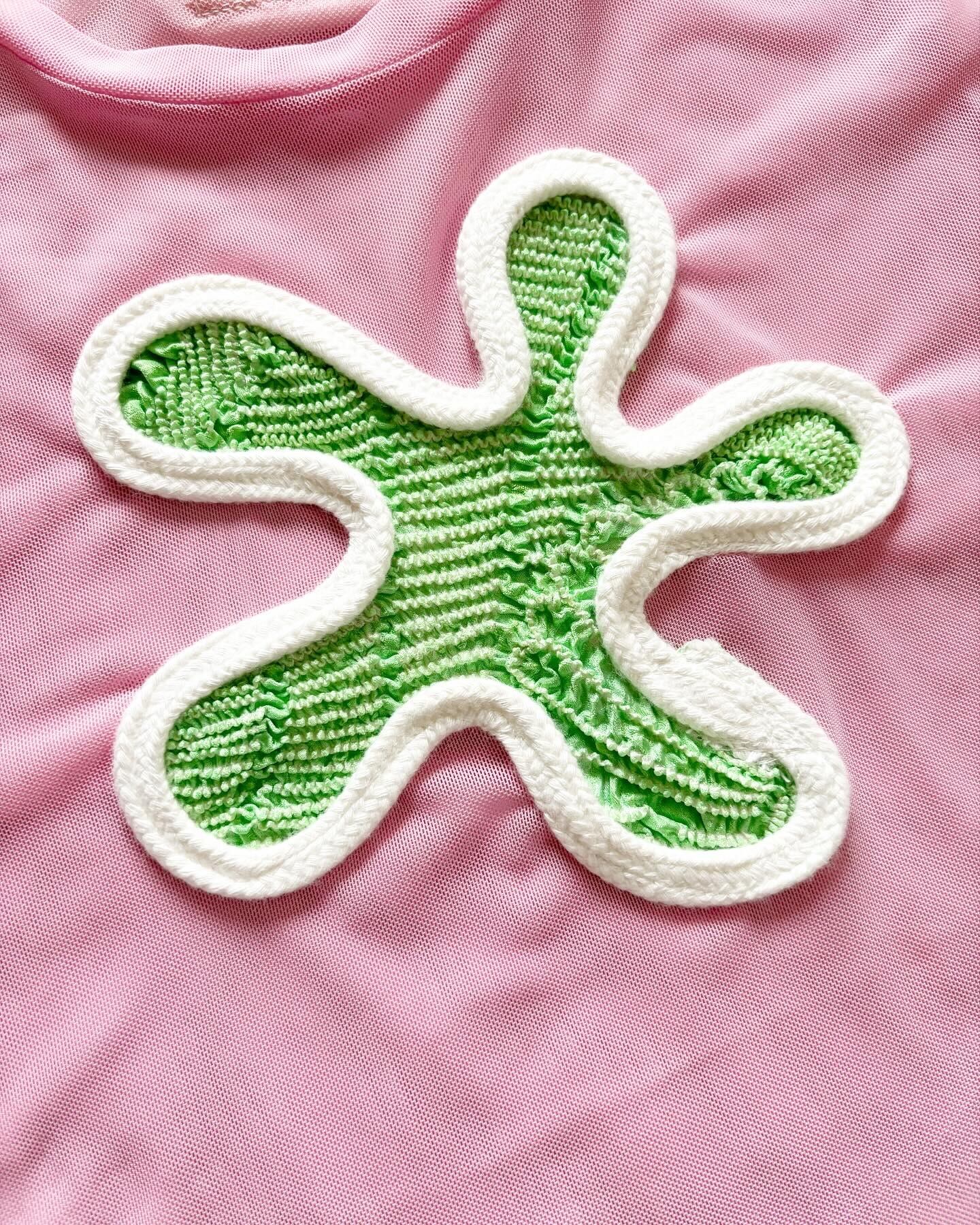 このお花モチーフは、東京のSHIBUYAを中心に大活躍されるとってもイカしたDJの方に浴衣を作らせてら頂いた時に誕生しました。DJのおしごとは、音楽を上手に繋いでフロアのグルーヴをつくる事!そんな楽しいvibesをシケらせないように、ポップでダンサブルな浴衣にしたくてイメージしていた時、このお花は生まれました!