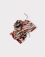 ブランドタグも着物の絹地を有効利用してひとつひとつ手作りし、手で縫い付けています。