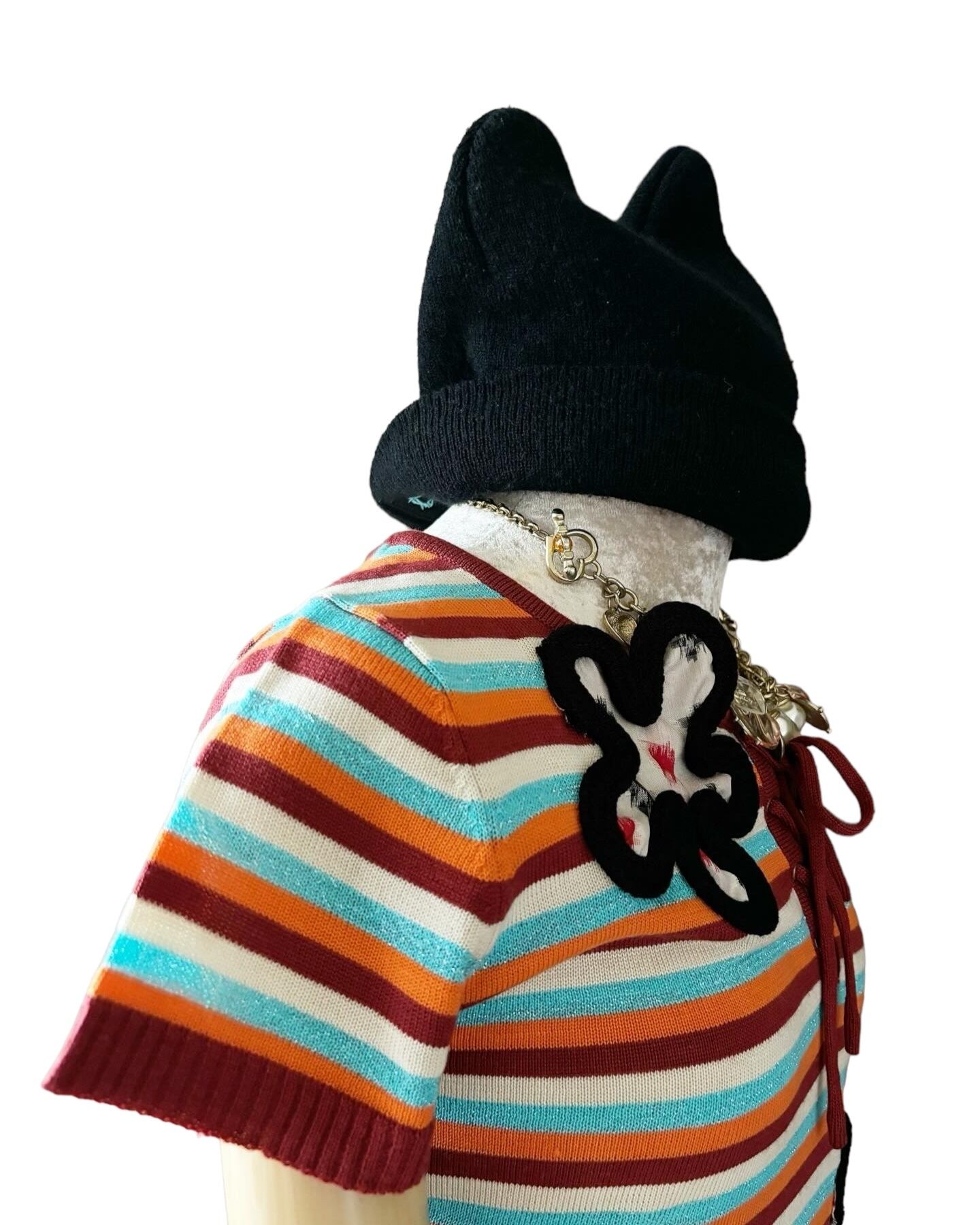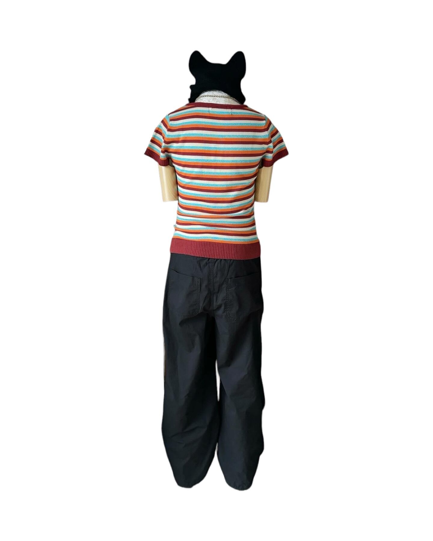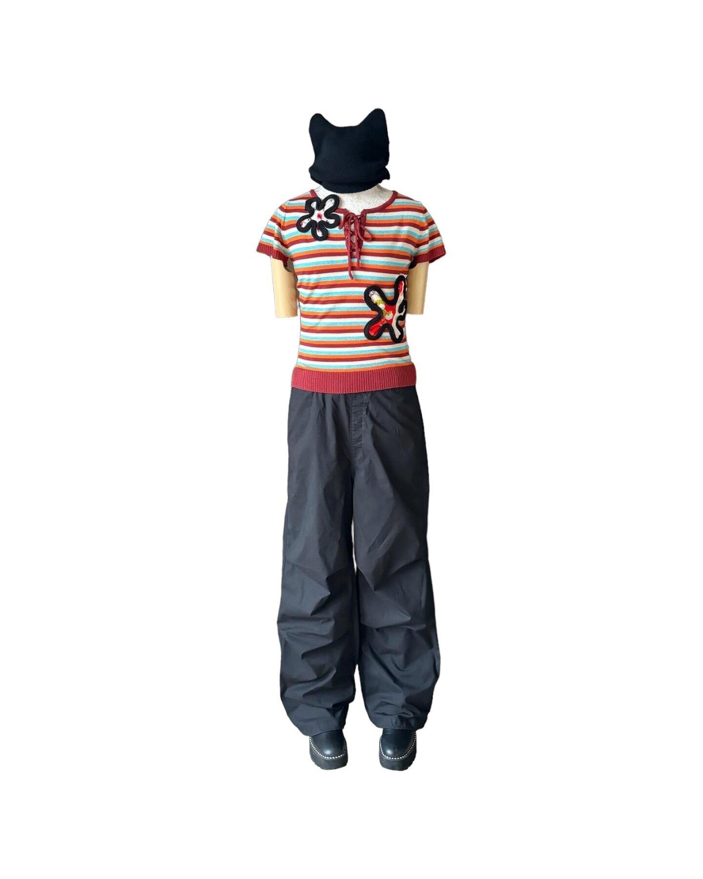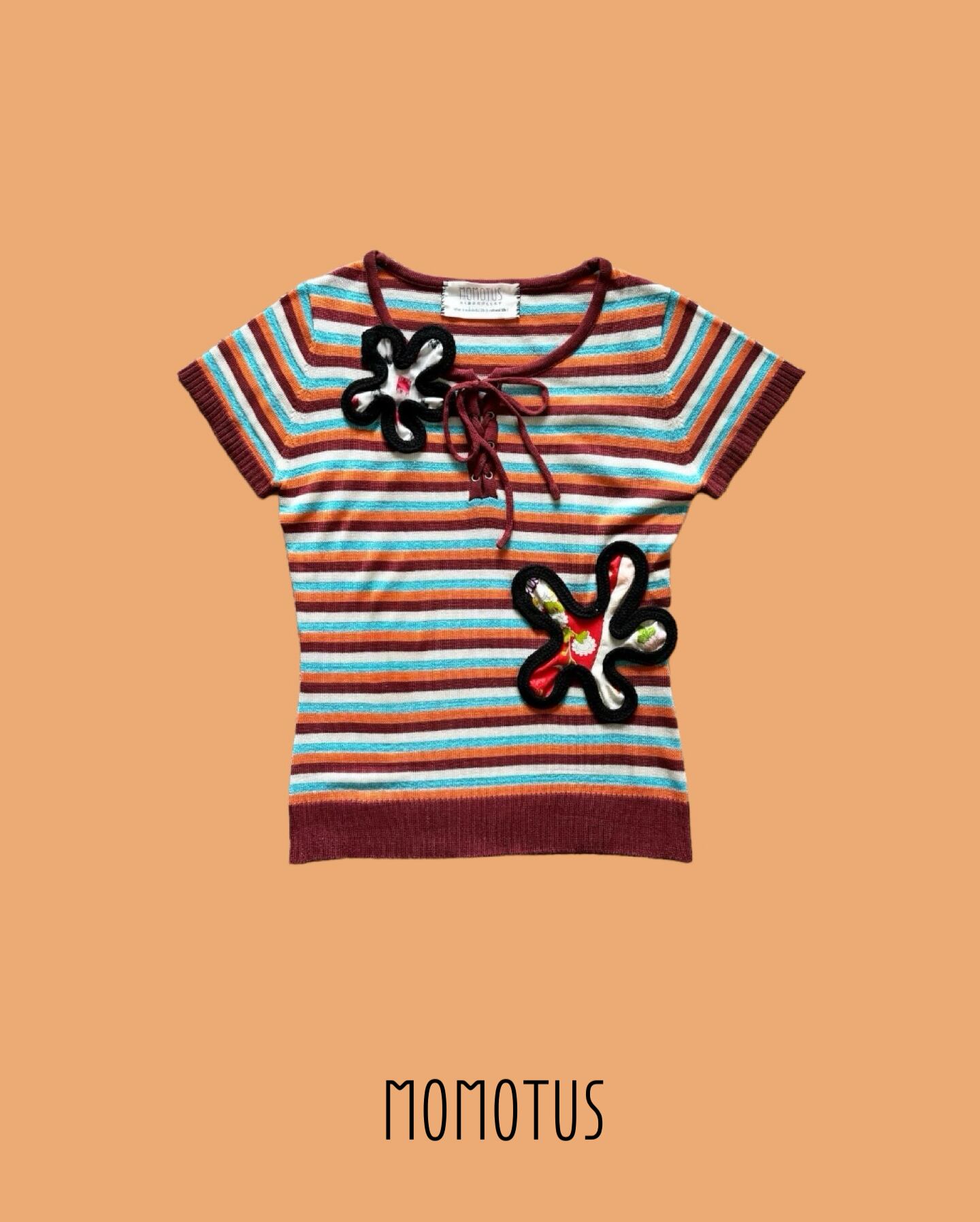 循環済♻️sold! no.390|和レトロなy2k古着(#ふら和あーちゃん)KIMONOlabリメイク! チビT・編み上げトップス、ラメ、ニットT、ボーダーT、花柄