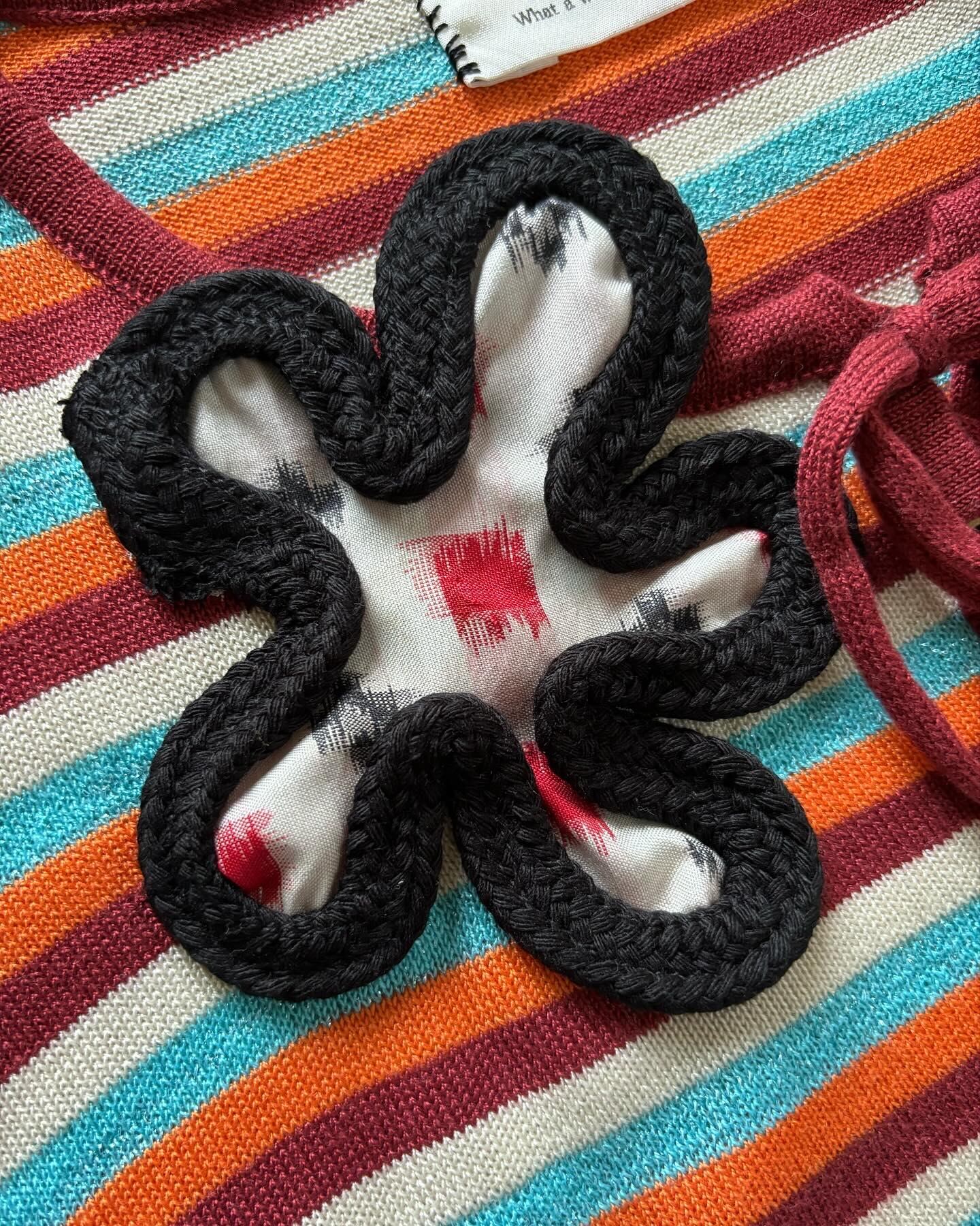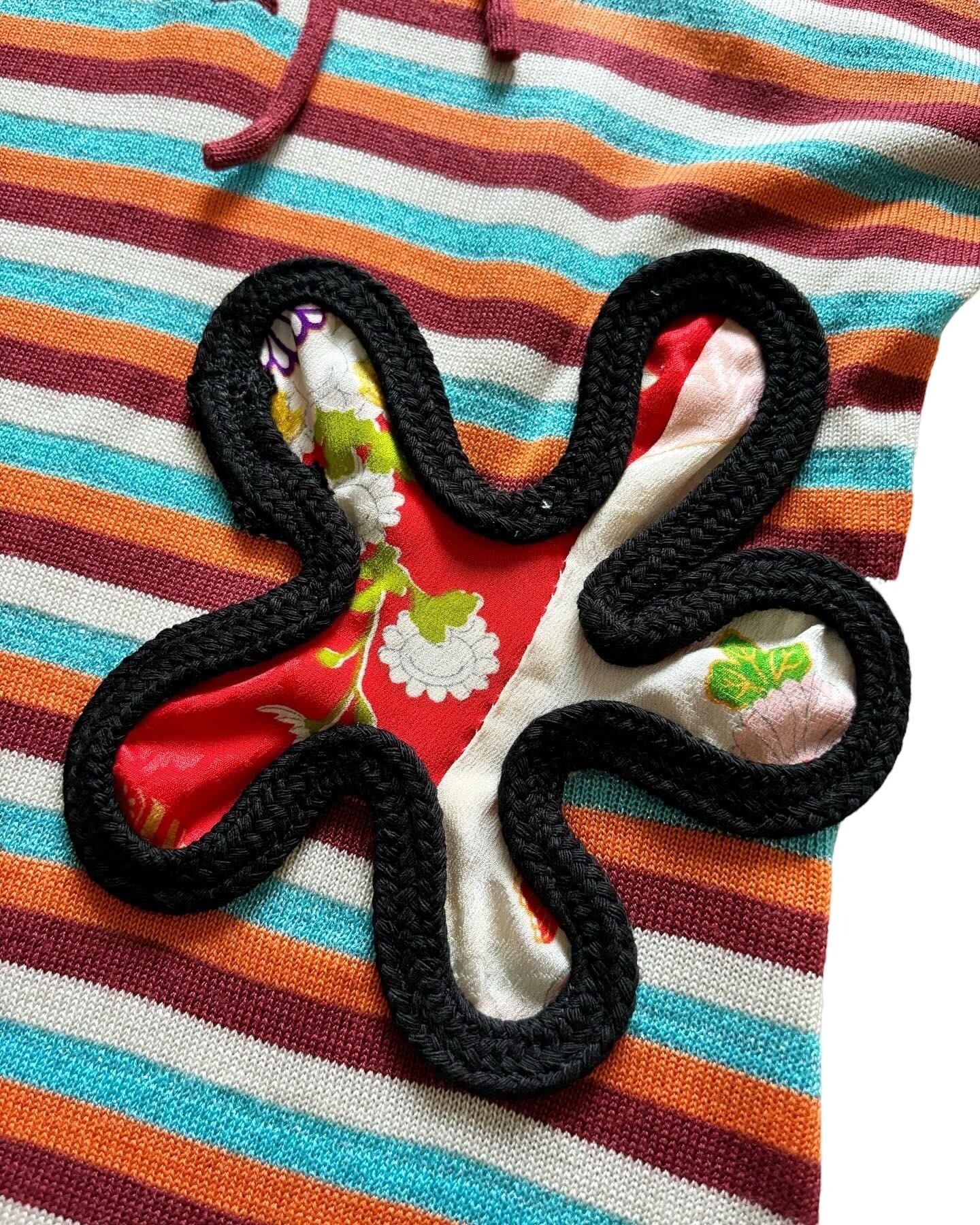 このお花モチーフは、東京のSHIBUYAを中心に大活躍されるとってもイカしたDJの方に浴衣を作らせてら頂いた時に誕生しました。DJのおしごとは、音楽を上手に繋いでフロアのグルーヴをつくる事!そんな楽しいvibesをシケらせないように、ポップでダンサブルな浴衣にしたくてイメージしていた時、このお花は生まれました!
