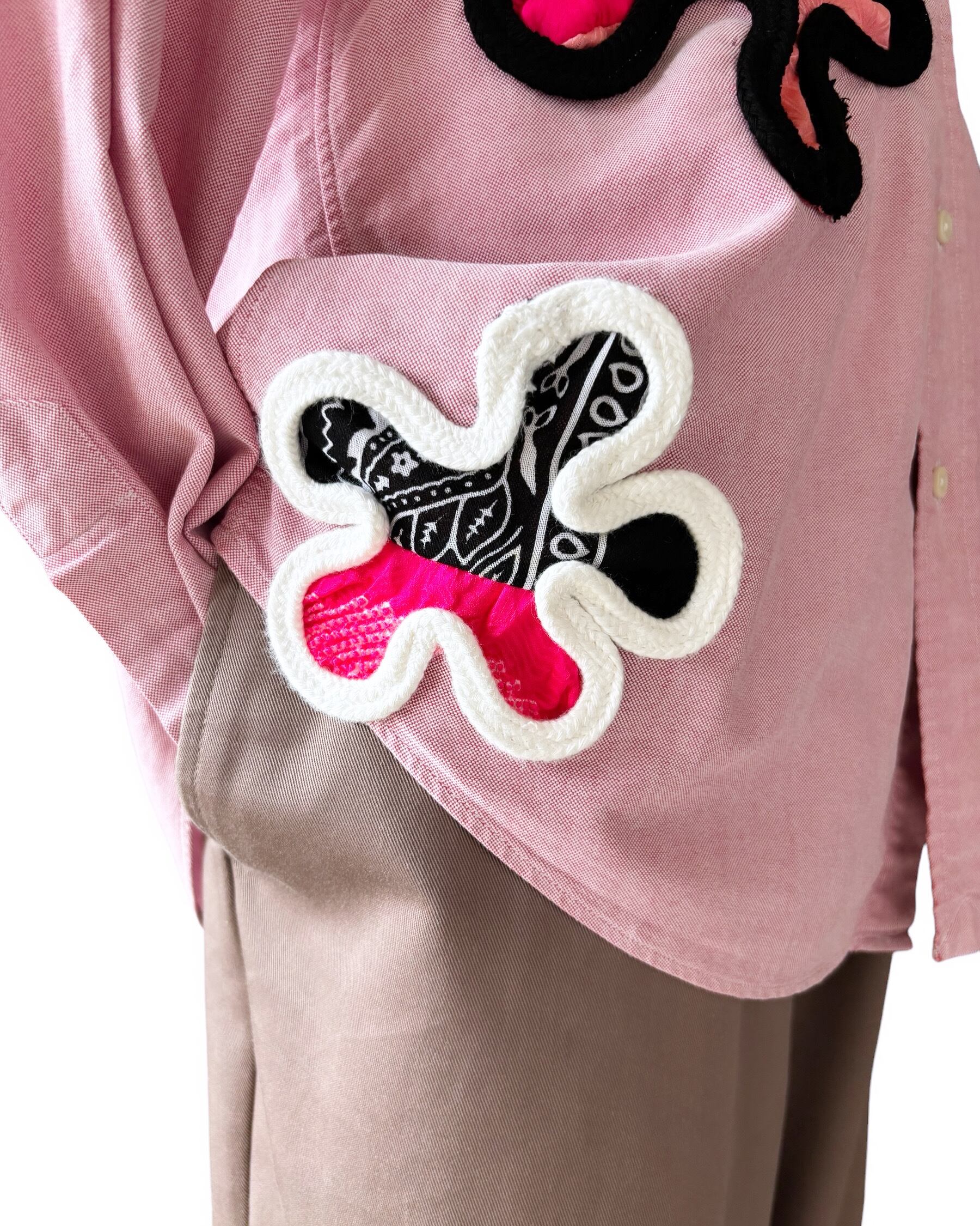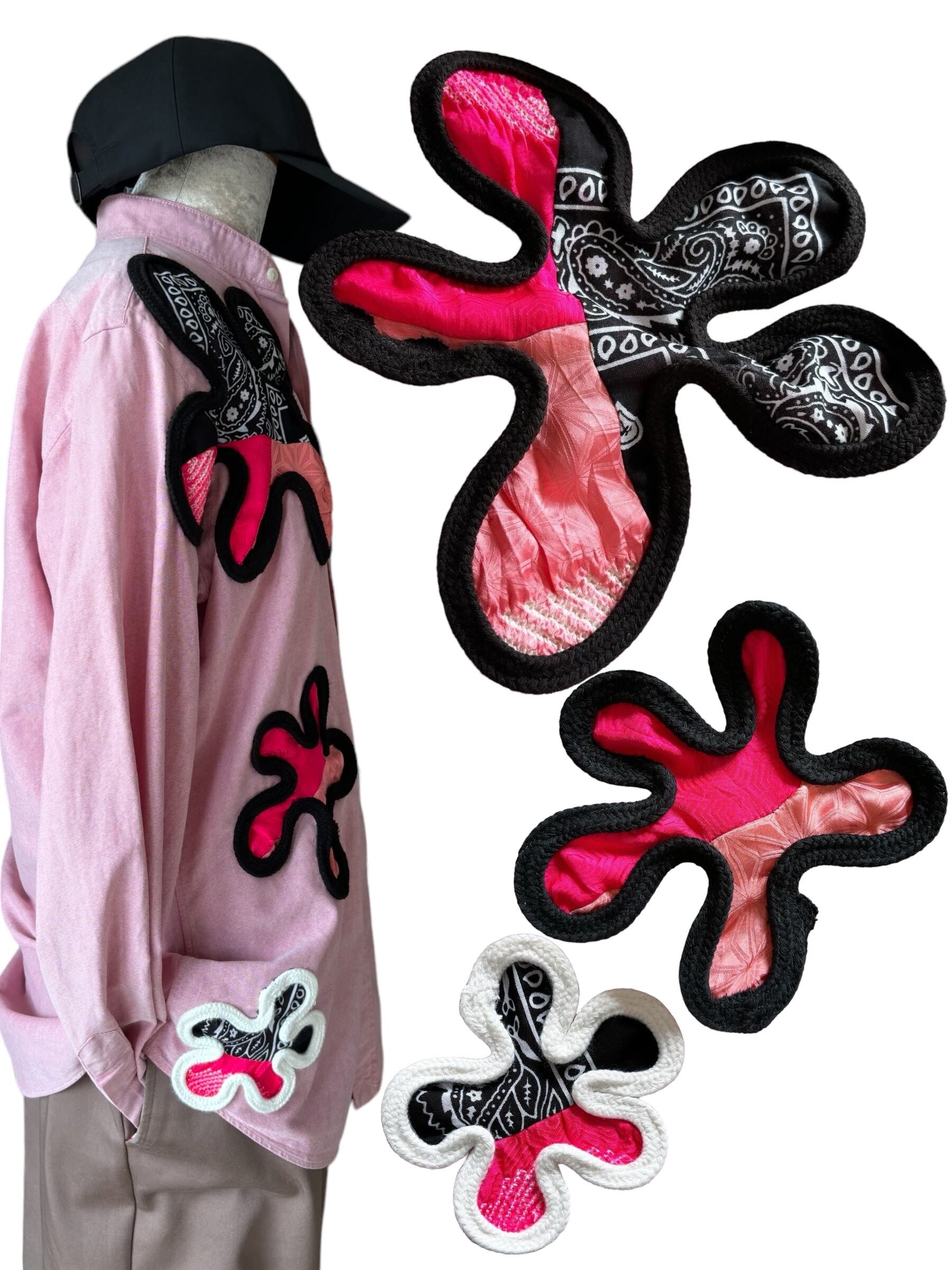 このお花モチーフは、東京のSHIBUYAを中心に大活躍されるとってもイカしたDJの方に浴衣を作らせてら頂いた時に誕生しました。DJのおしごとは、音楽を上手に繋いでフロアのグルーヴつくる事!そんな楽しいvibesをシケらせないように、ポップでダンサブルな浴衣にしたくてイメージしていた時、このお花は生まれました!