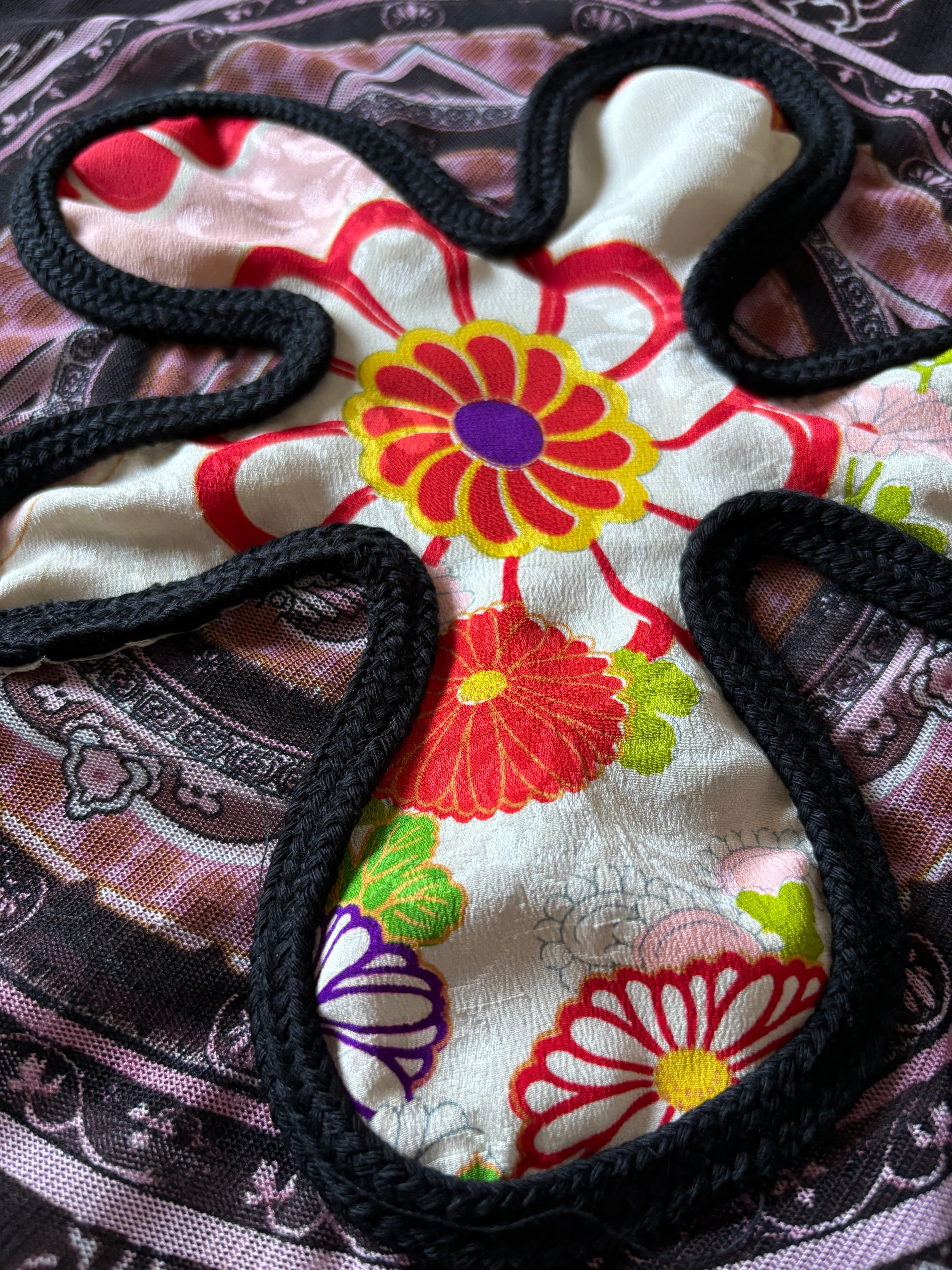 このお花モチーフは、東京のSHIBUYAを中心に大活躍されるとってもイカしたDJの方に浴衣を作らせてら頂いた時に誕生しました。DJのおしごとは、音楽を上手に繋いでフロアのグルーヴをつくる事!そんな楽しいvibesをシケらせないように、ポップでダンサブルな浴衣にしたくてイメージしていた時、このお花は生まれました!